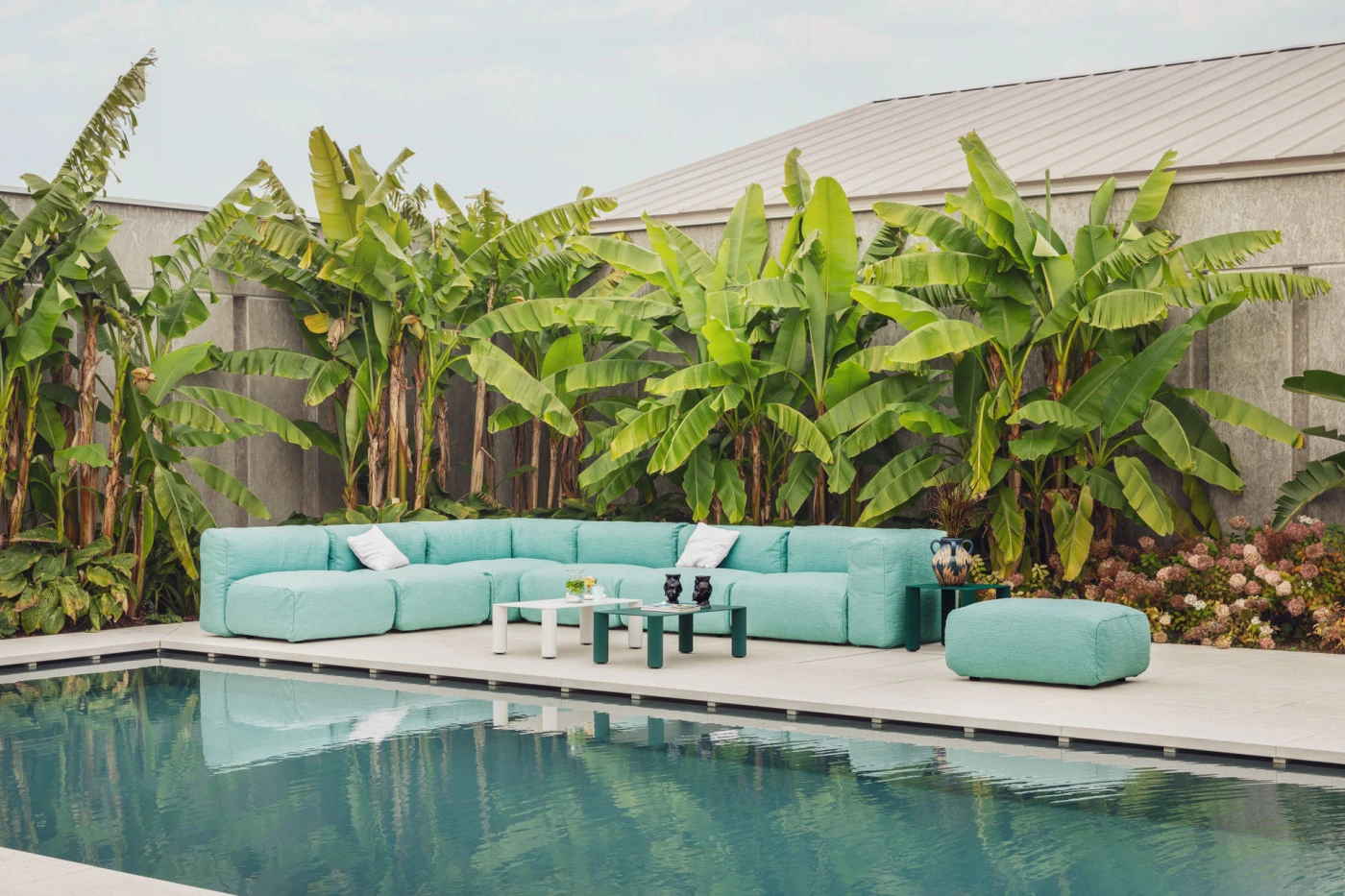 Versiune pentru exterior: configuratie disponibila cu material textil specific pentru exterior.
