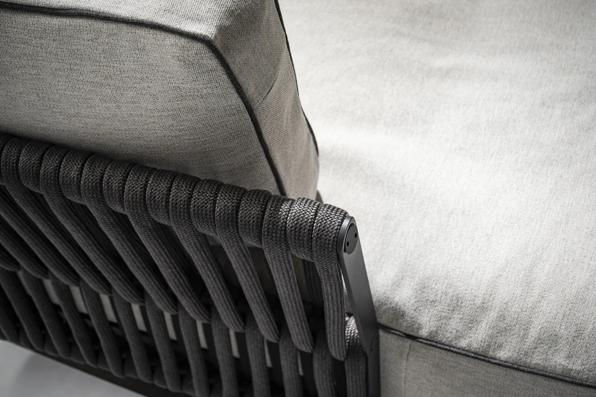 Spatarul invaluitor si confortabil, din impletitura captusita antracit, are o captuseala din spuma poliuretanica ignifuga, cu husa impermeabila si captuseala exterioara conform colectiei si bordura contrastanta.