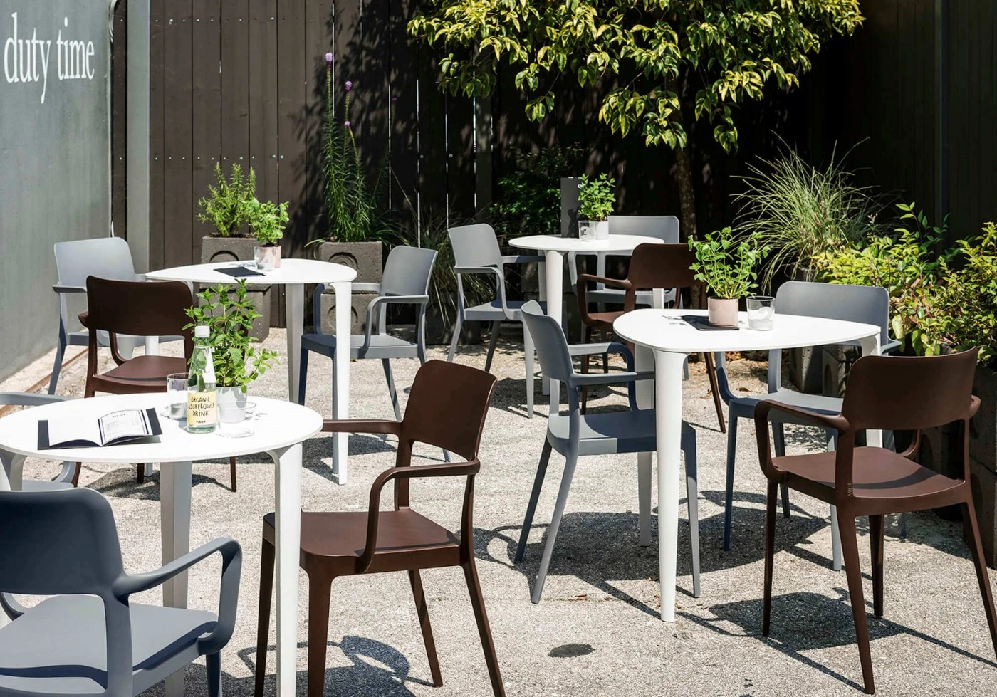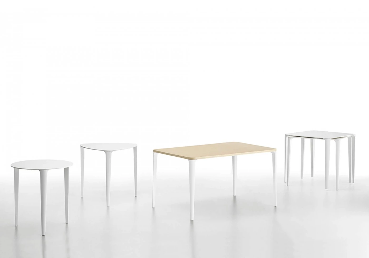 Masa triunghiulara Nenè cu trei picioare din metal lacuit.