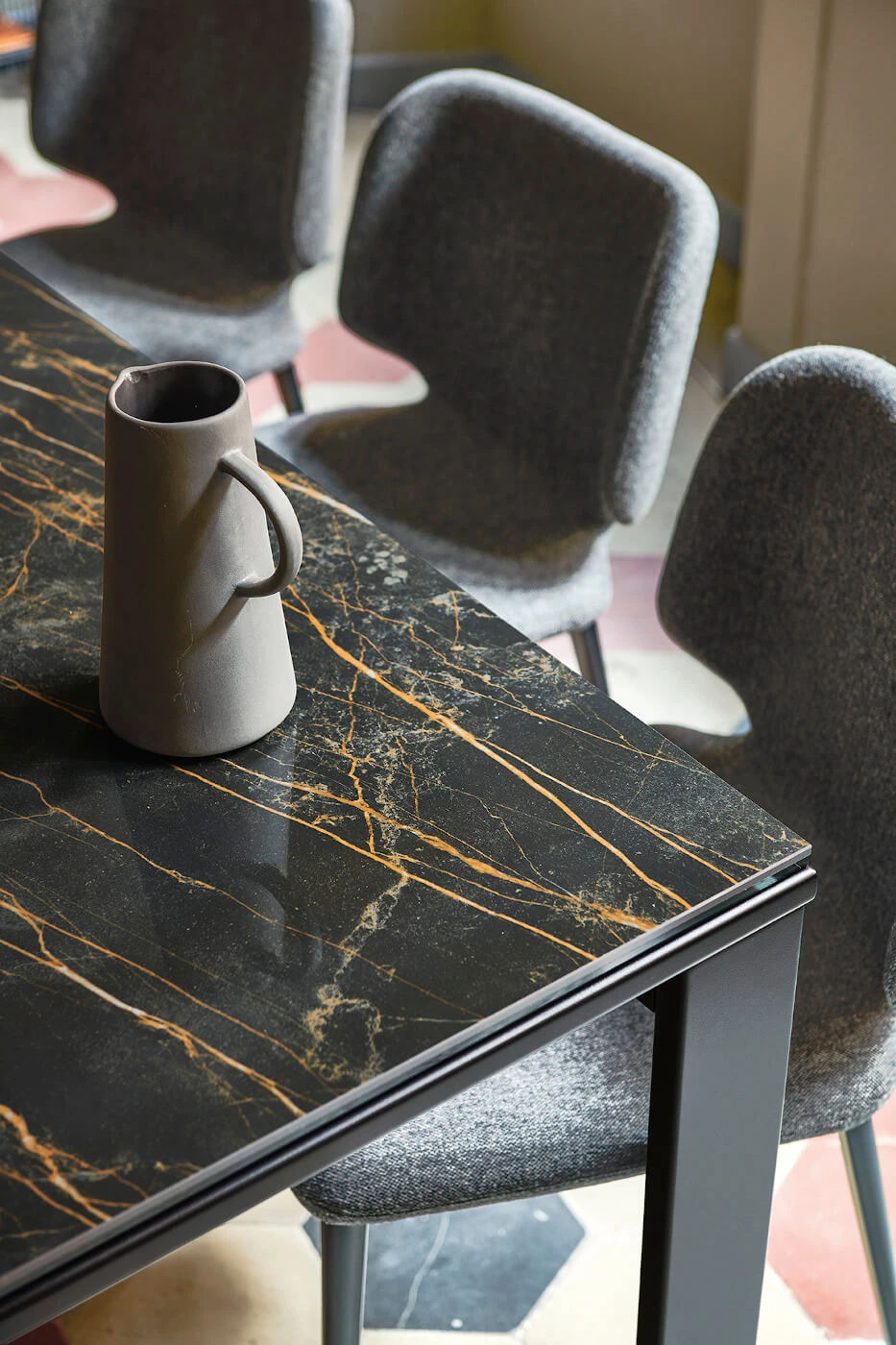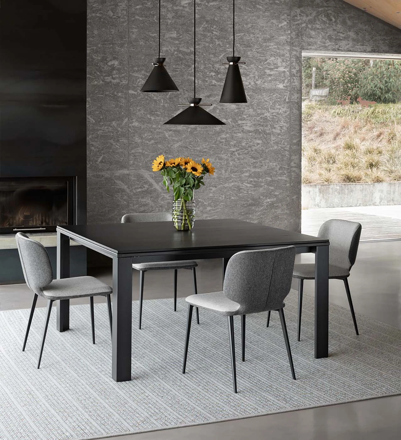 Blat si extensii din sticla, cristalceramica sau lemn furniruit de nuc, stejar sau frasin.