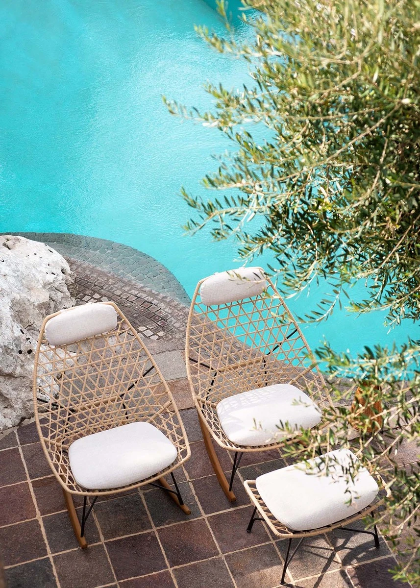 In versiunea sa pentru exterior, Cut completeaza canapeaua bergère cu suport pentru picioare, cu un fotoliu nou, un taburet, un scaun si o balansoar bergère care urmeaza profilul sau conceput si esential. Colectia prinde contur dintr-o structura din tija de otel acoperita cu pulbere epoxidica, care contureaza silueta armonioasa si lunga a picioarelor si a sezutului, si o panglica „Gassa” bej tesuta manual. Tesatura acomodeaza perna moale si contrastanta a sezutului, care accentueaza detaliile lucrate manual prin diferente de culoare.