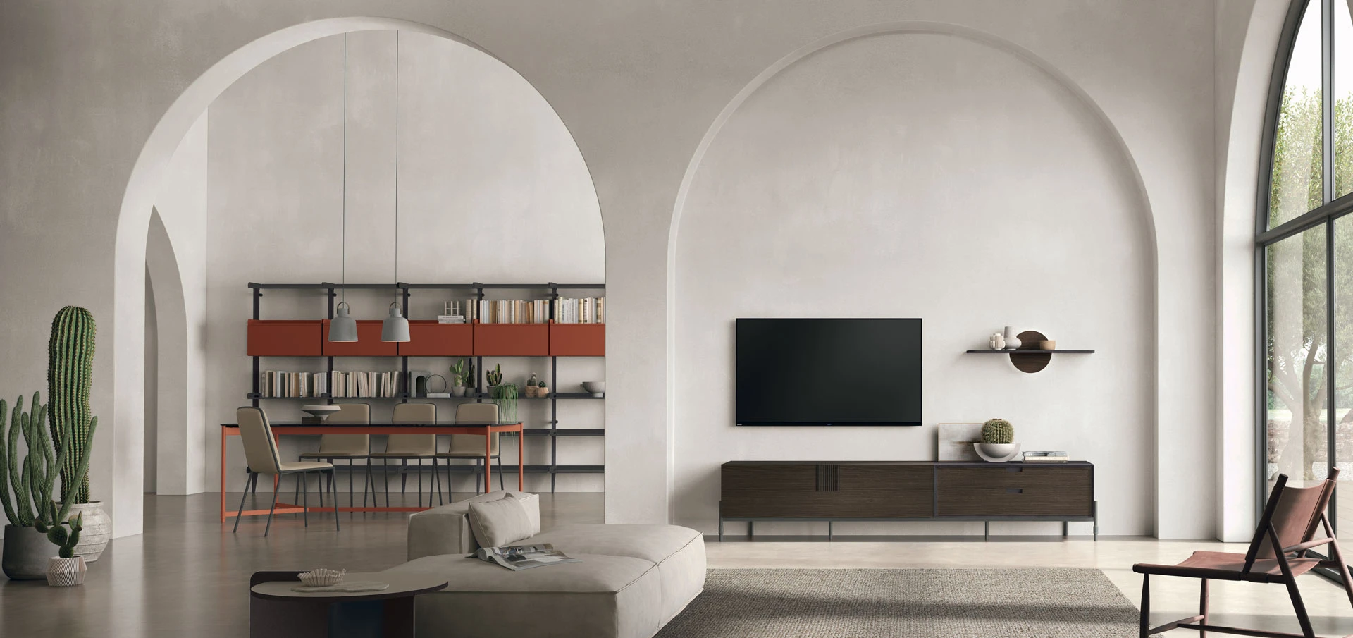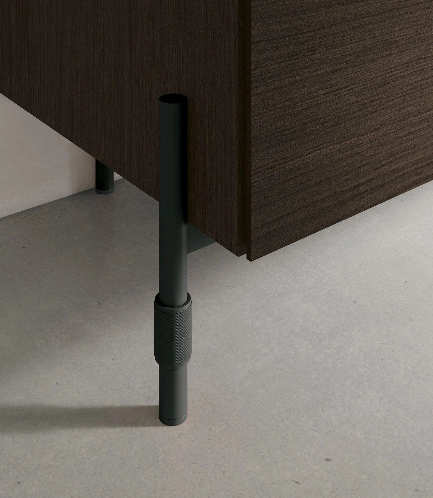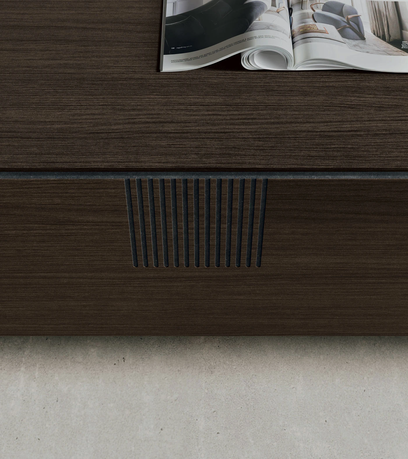 Unitatea de depozitare din CDF stejar mocha este curata si liniara, dar iese in evidenta prin detaliile sale: modulul cu sertare din CDF negru cu nervuri, inciziile verticale care dezvaluie miezul materialului si baza din metal Time.