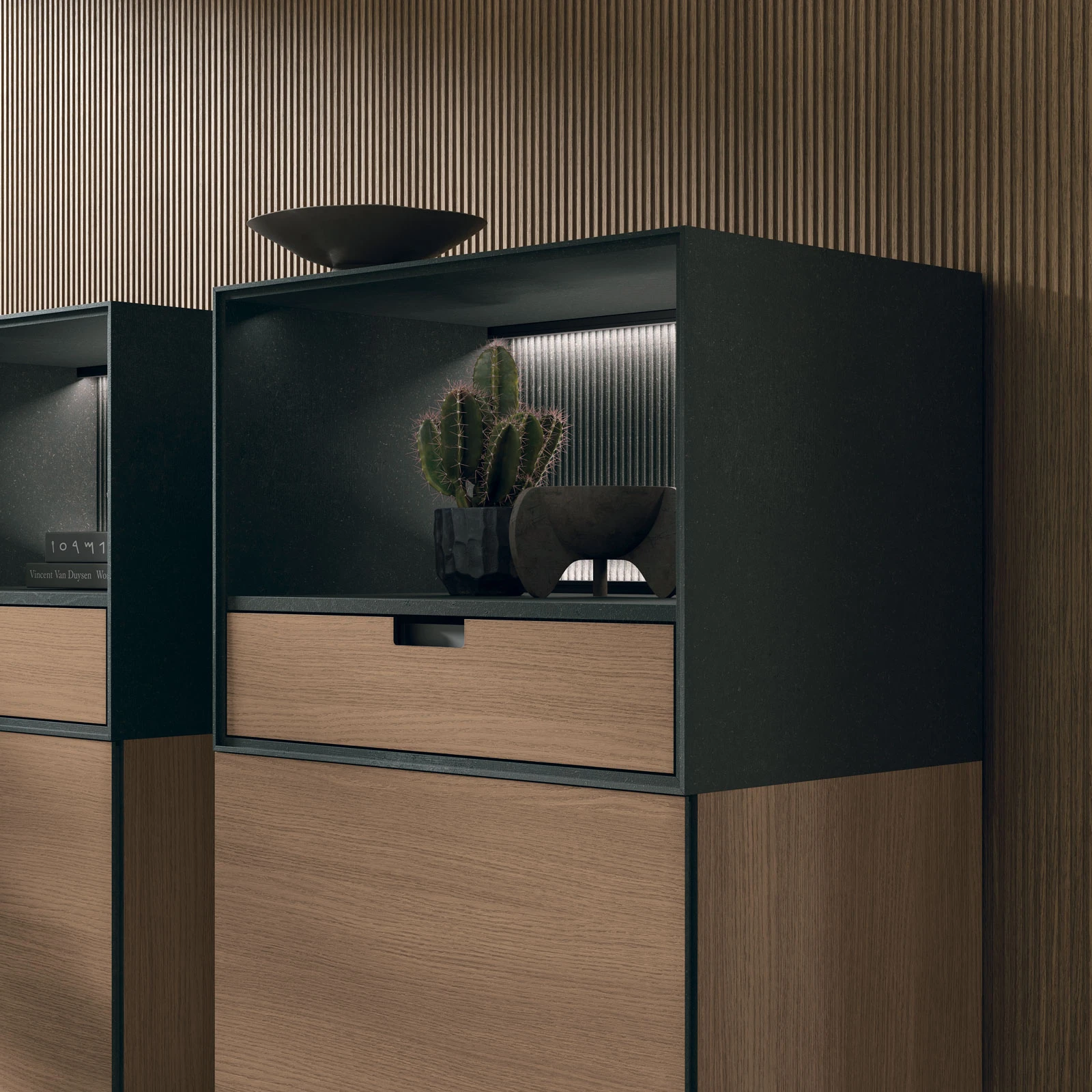 Finisaje foto / CDF negru venat, CDF stejar cognac si CDF negru venat stuf. Baza Time din metal antracit 160.