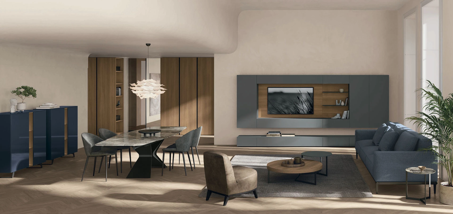 De o parte si de alta a mecanismului usii glisante cu sina, doua dulapuri din stejar texturat cognac se comporta ca niste elemente arhitecturale autentice: pozitionate de o parte si de alta a unei usi glisante, acestea contribuie la delimitarea spatiului care separa camera de zi de celelalte camere ale casei. Rafturile deschise de pe panourile laterale, folosite ca biblioteca, reprezinta o modalitate practica si rafinata de a expune carti si obiecte decorative.