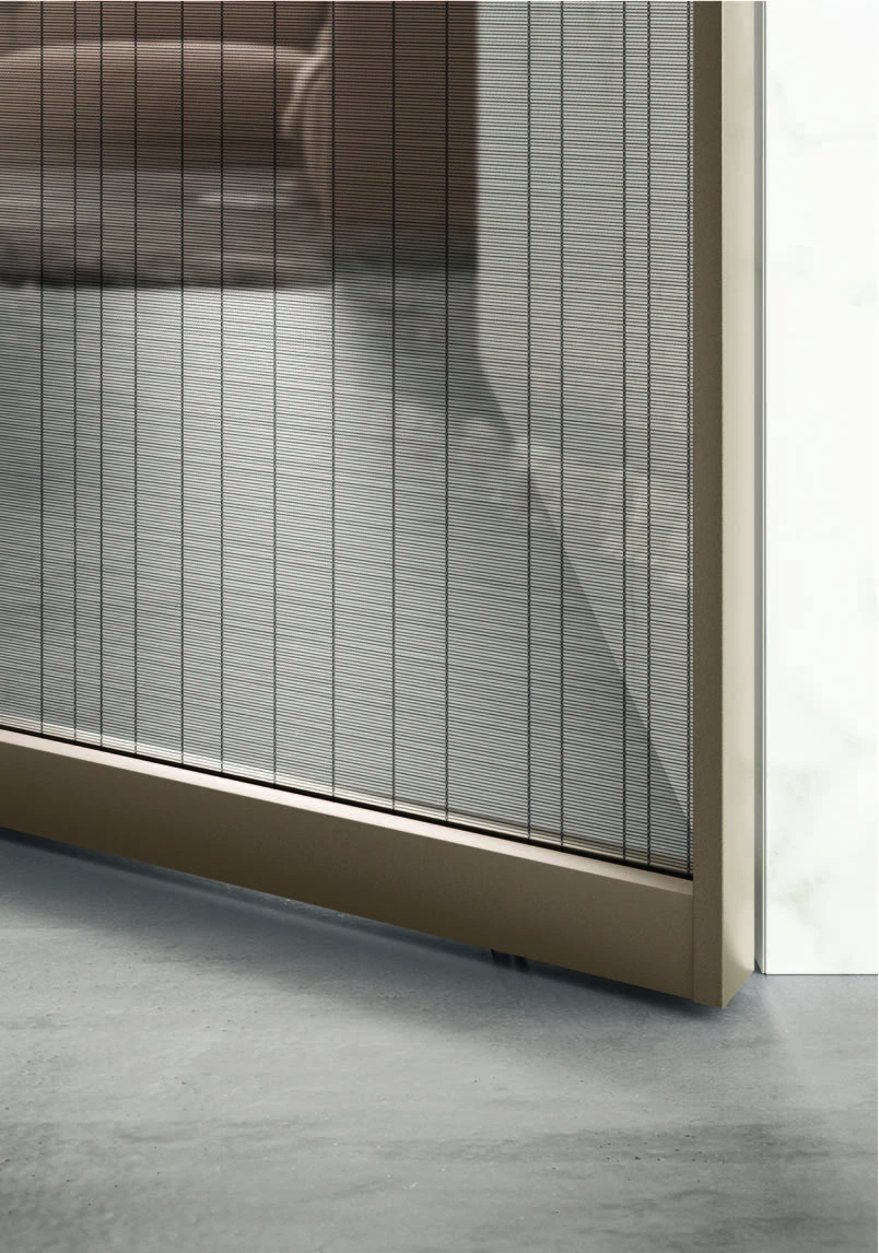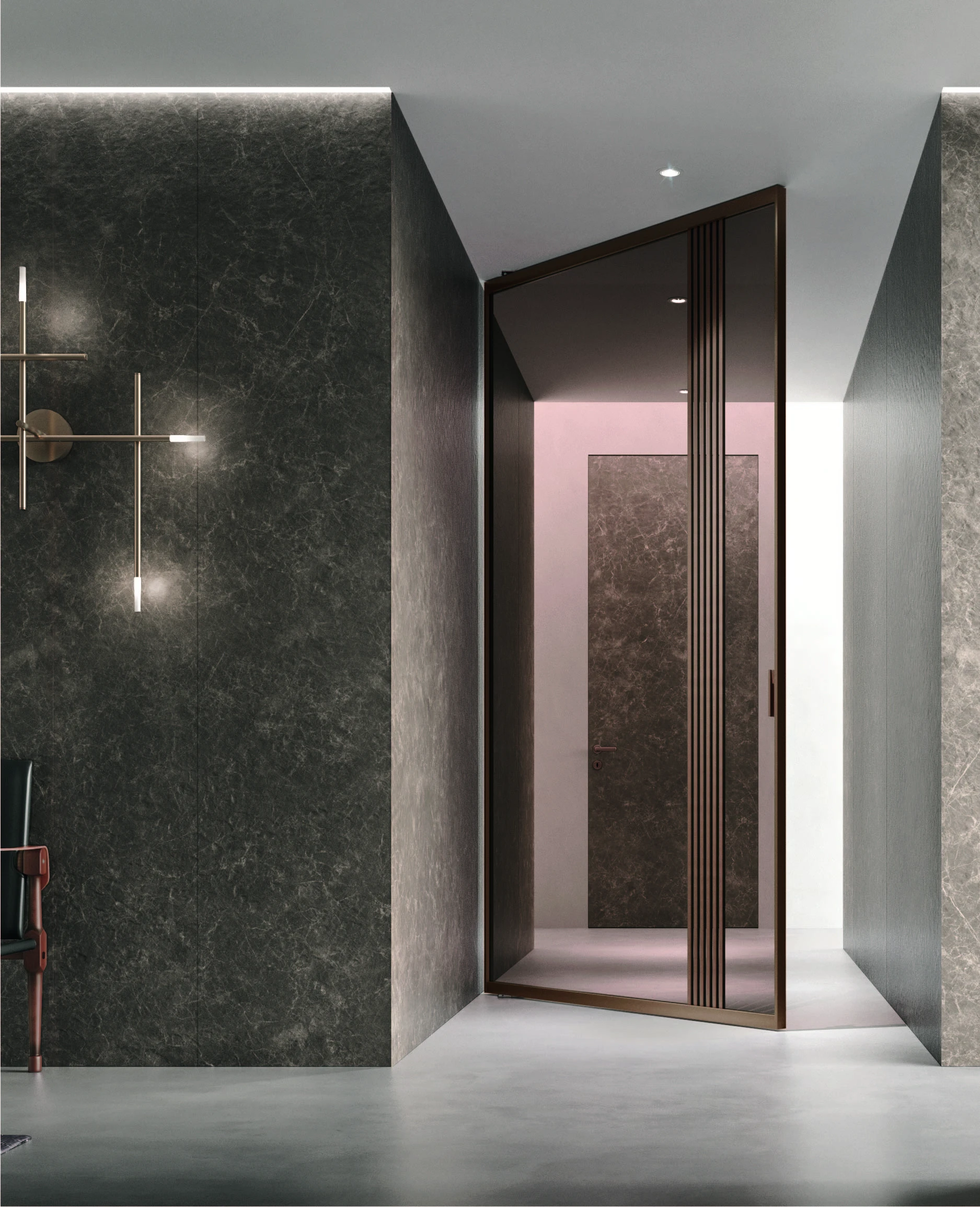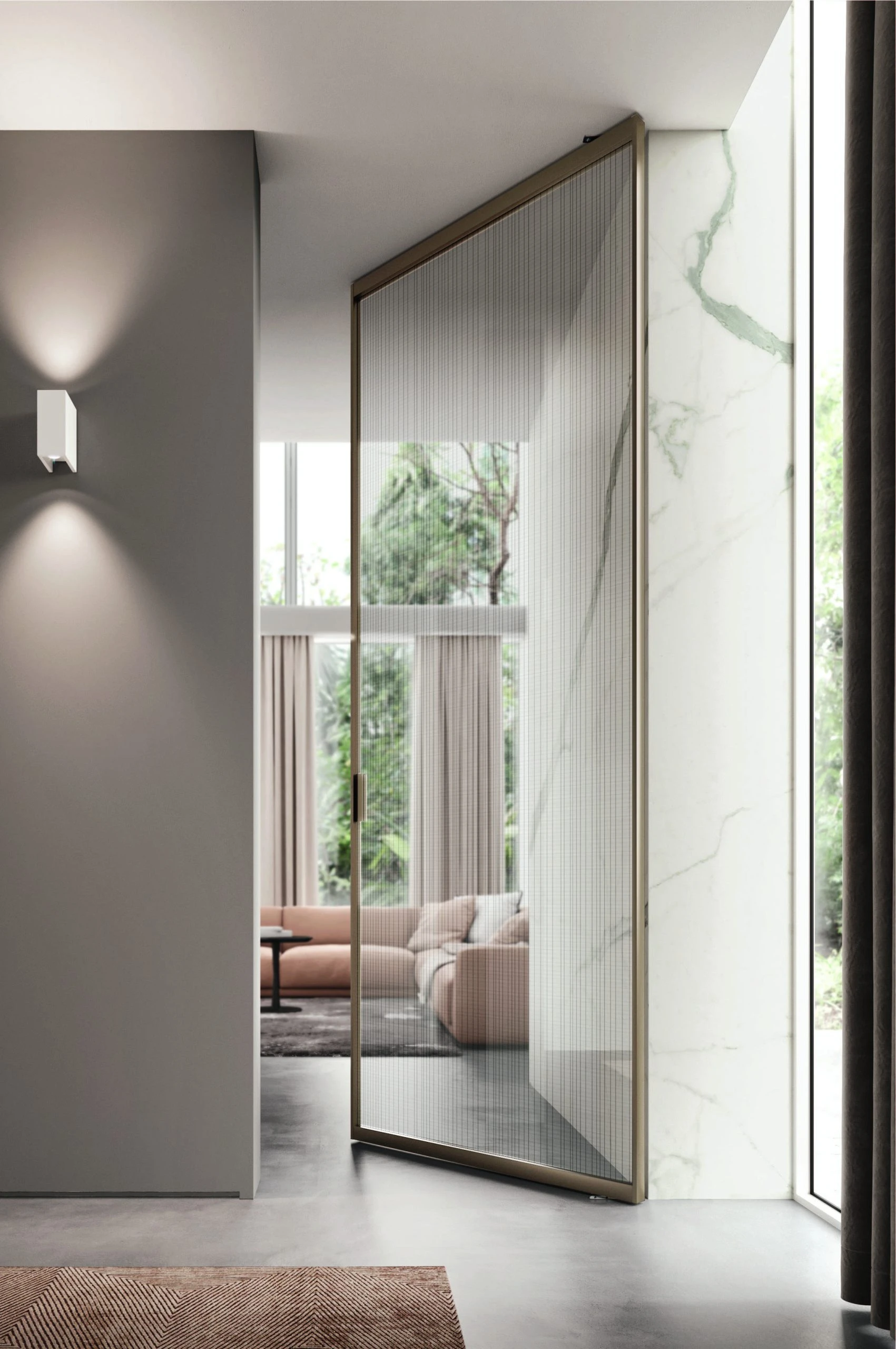 Usa Bilico se roteste pe un pivot, iar sticla, cu diferite finisaje, este incadrata de o rama subtire din aluminiu lacuit sau invelit in folie. Sistemul este bidirectional si poate fi integrat printr-o balama cu autoinchidere.